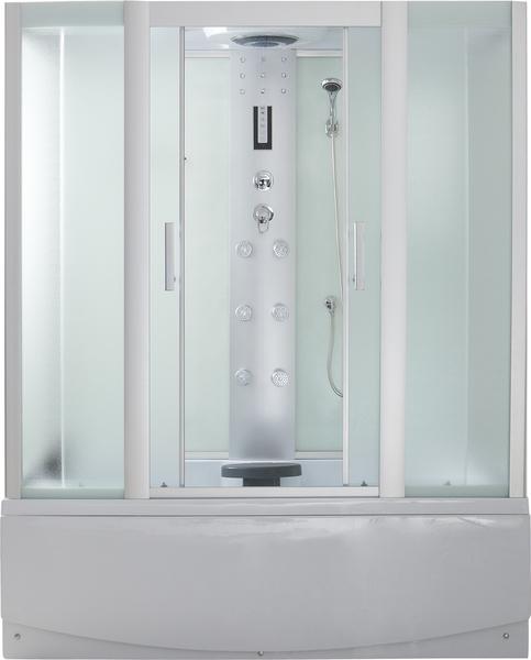 Гидромассаж спины, верхний свет и душ, вентилятор, стойка пластик хром, радио и телефон, хромированный профиль, белая стенка, дверцы - матовое стекло, кнопочный пульт,подголовник, сиденье с фикс.